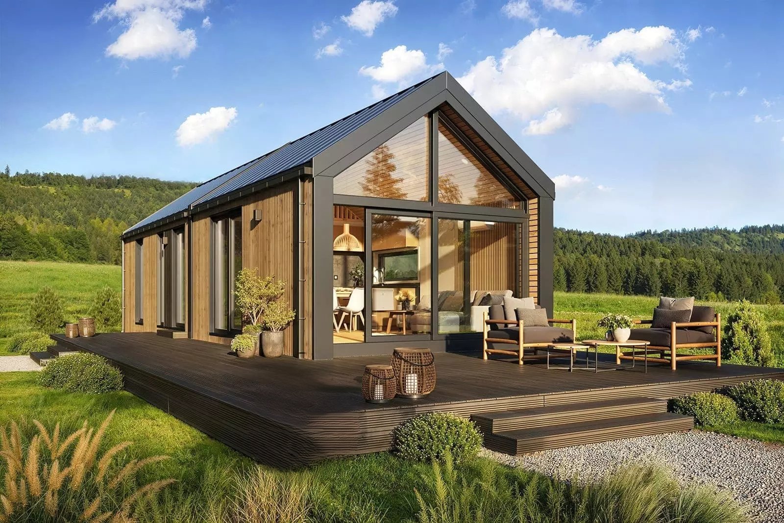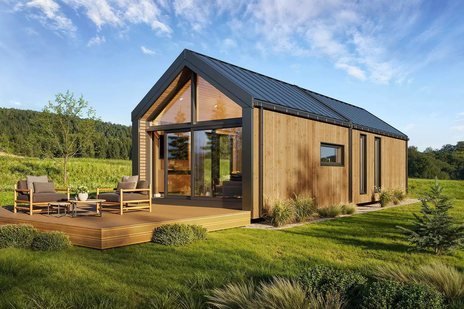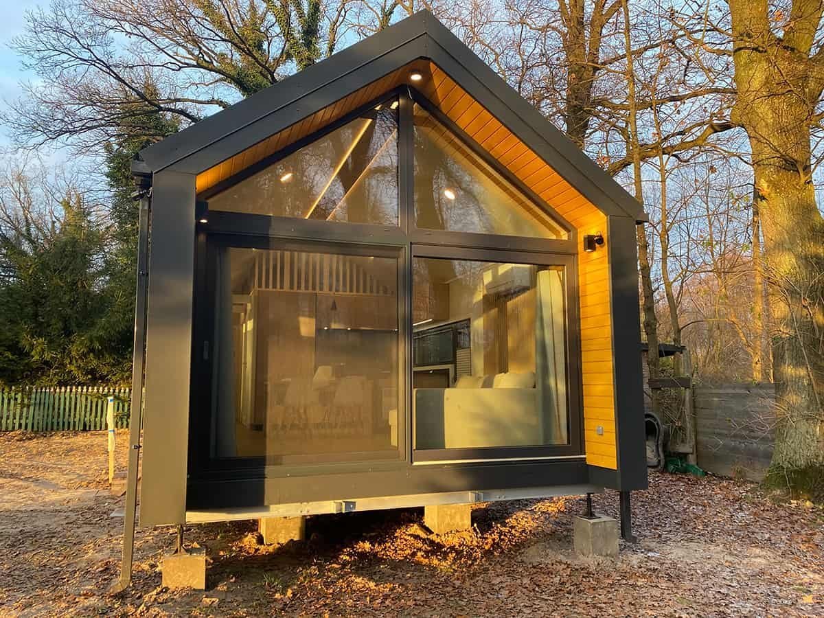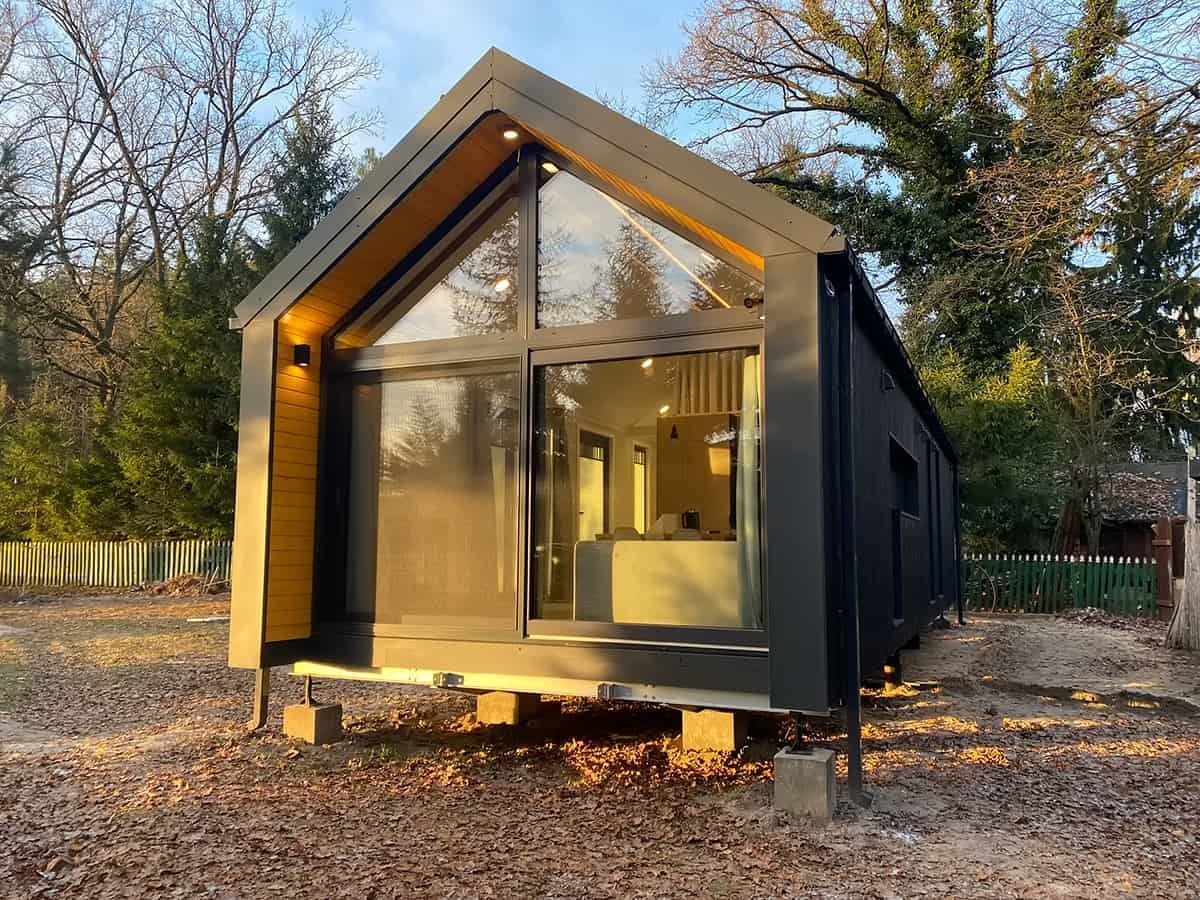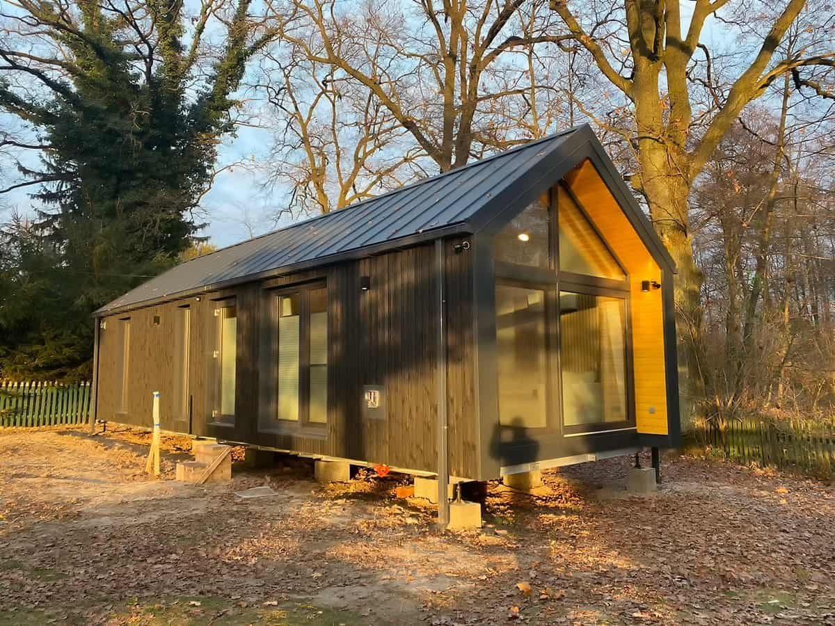 La palette de couleurs de la maison,  revêtue  de panneaux de façade  , est entièrement personnalisable : on peut choisir parmi les teintes bois et anthracite proposées pour les murs de base et la toiture, ou opter pour une palette monochrome graphite et noire. L’aspect des façades extérieures –  la disposition des fenêtres , des portes-fenêtres et de la porte d’entrée – est également modulable selon la variante intérieure choisie. Dans la version de base et les variantes 2 et 3, nous proposons une large  baie vitrée sur toute la façade pignon,  avec portes coulissantes. La maison mobile F3  peut être construite sur châssis mobile (avec roues ) ou sur  châssis fixe plus bas (sans roues) . Dans les deux cas, nous recommandons une installation sur  fondations ponctuelles . Quelle que soit la configuration du châssis, la maison forme un ensemble compact et se transporte et se déplace aisément.