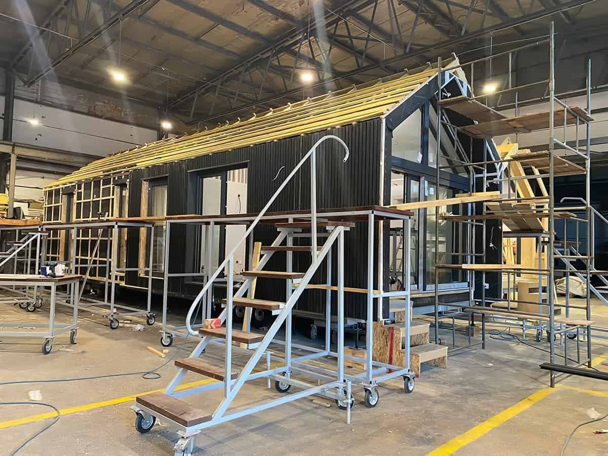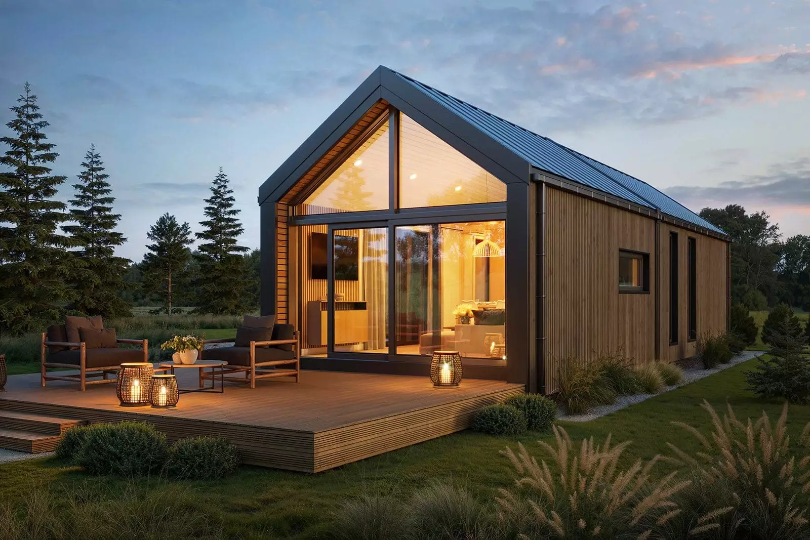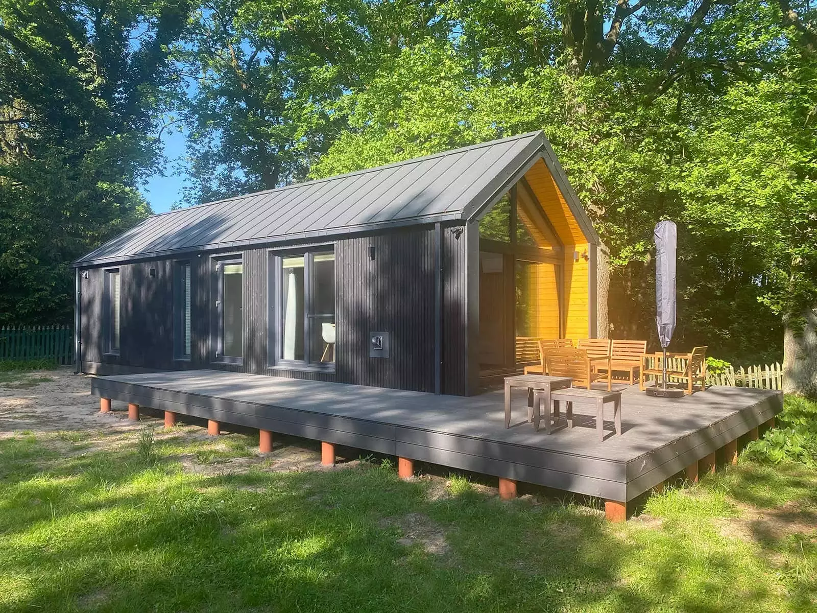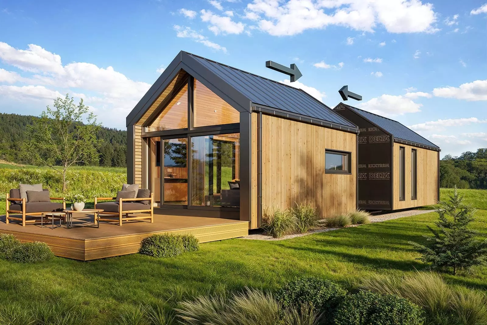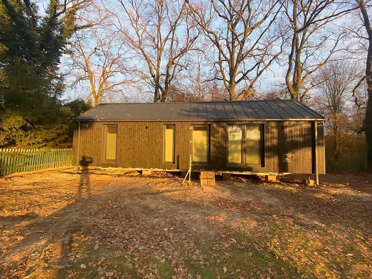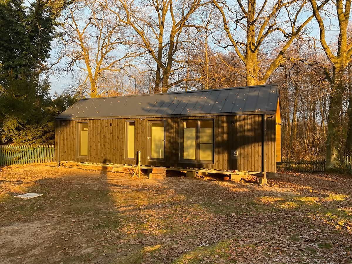 La palette de couleurs de la maison,  revêtue  de panneaux de façade  , est entièrement personnalisable : on peut choisir parmi les teintes bois et anthracite proposées pour les murs de base et la toiture, ou opter pour une palette monochrome graphite et noire. L’aspect des façades extérieures –  la disposition des fenêtres , des portes-fenêtres et de la porte d’entrée – est également modulable selon la variante intérieure choisie. Dans la version de base et les variantes 2 et 3, nous proposons une large  baie vitrée sur toute la façade pignon,  avec portes coulissantes. La maison mobile F3  peut être construite sur châssis mobile (avec roues ) ou sur  châssis fixe plus bas (sans roues) . Dans les deux cas, nous recommandons une installation sur  fondations ponctuelles . Quelle que soit la configuration du châssis, la maison forme un ensemble compact et se transporte et se déplace aisément.