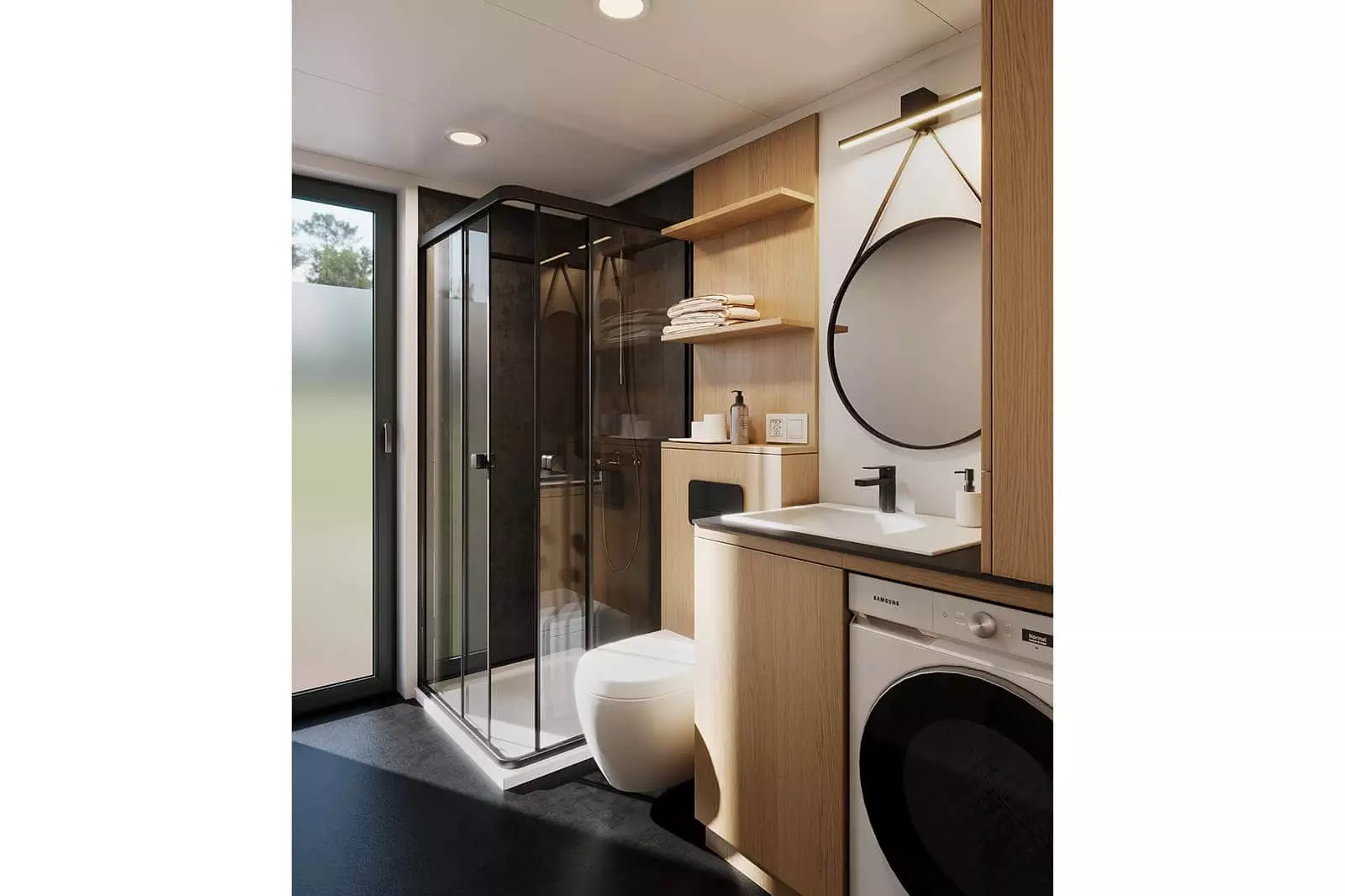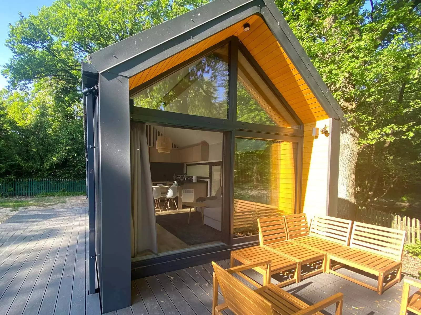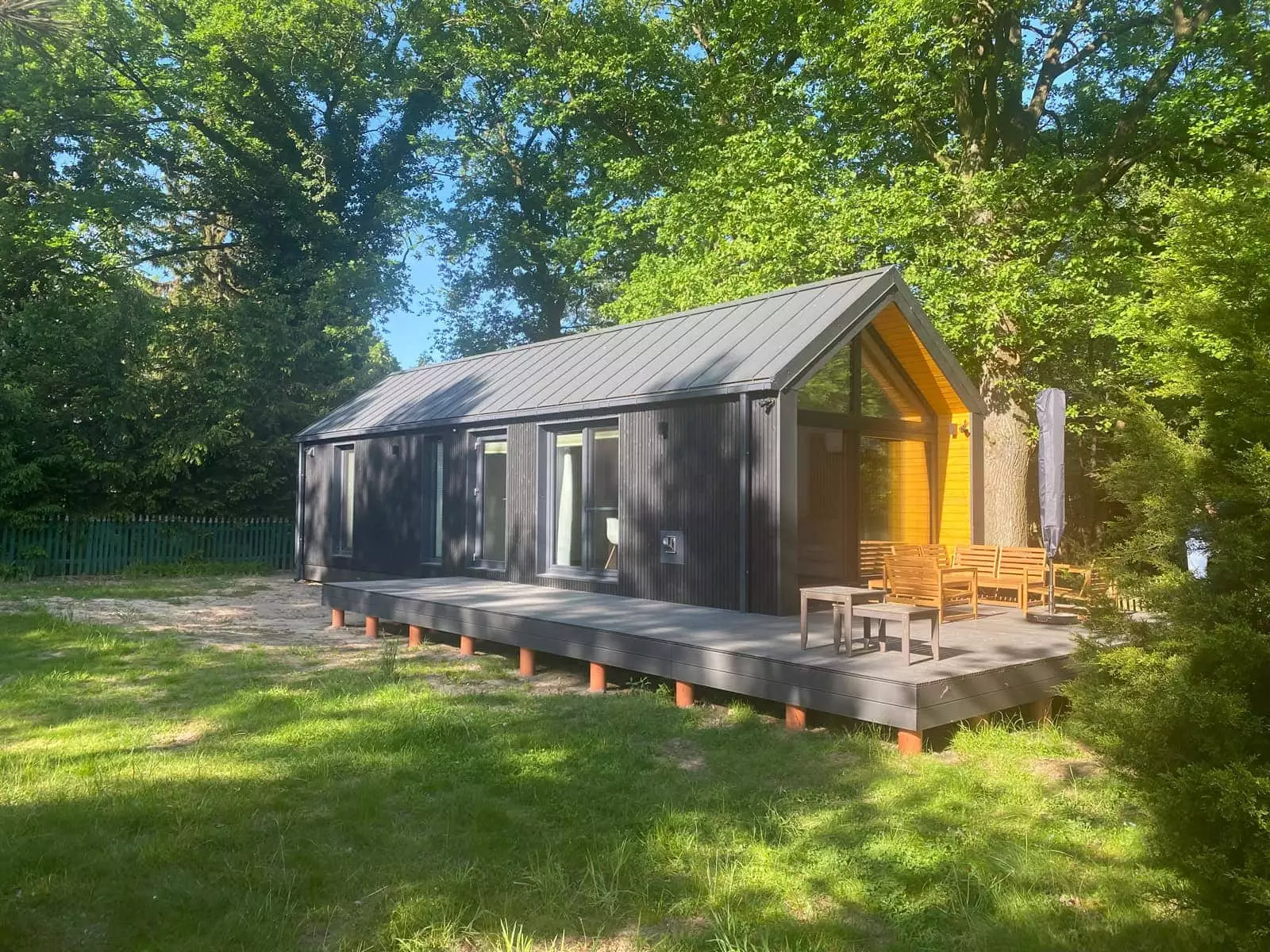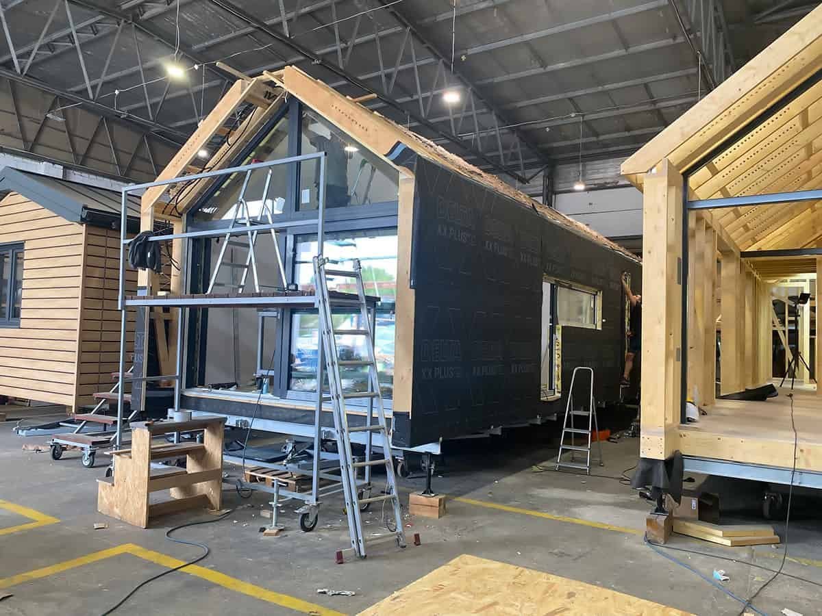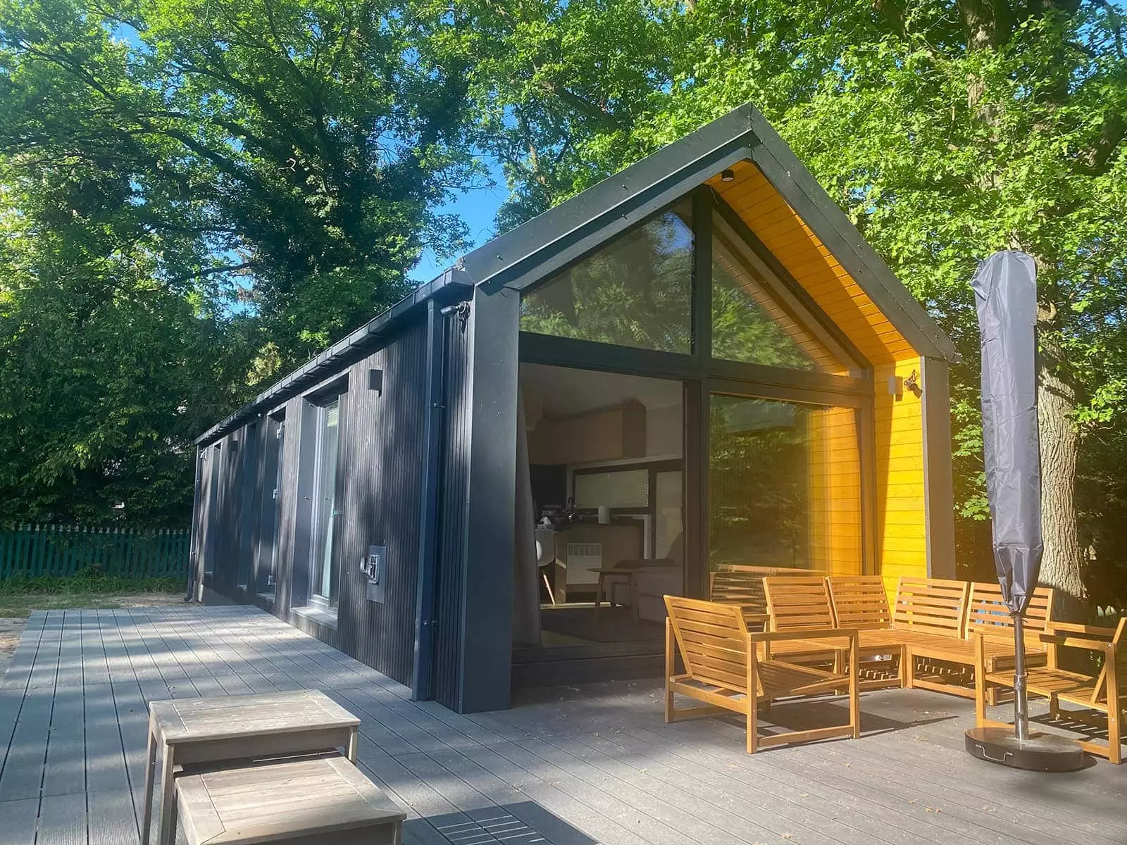 La palette de couleurs de la maison,  revêtue  de panneaux de façade  , est entièrement personnalisable : on peut choisir parmi les teintes bois et anthracite proposées pour les murs de base et la toiture, ou opter pour une palette monochrome graphite et noire. L’aspect des façades extérieures –  la disposition des fenêtres , des portes-fenêtres et de la porte d’entrée – est également modulable selon la variante intérieure choisie. Dans la version de base et les variantes 2 et 3, nous proposons une large  baie vitrée sur toute la façade pignon,  avec portes coulissantes. La maison mobile F3  peut être construite sur châssis mobile (avec roues ) ou sur  châssis fixe plus bas (sans roues) . Dans les deux cas, nous recommandons une installation sur  fondations ponctuelles . Quelle que soit la configuration du châssis, la maison forme un ensemble compact et se transporte et se déplace aisément.