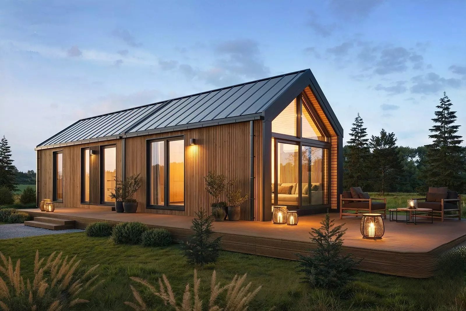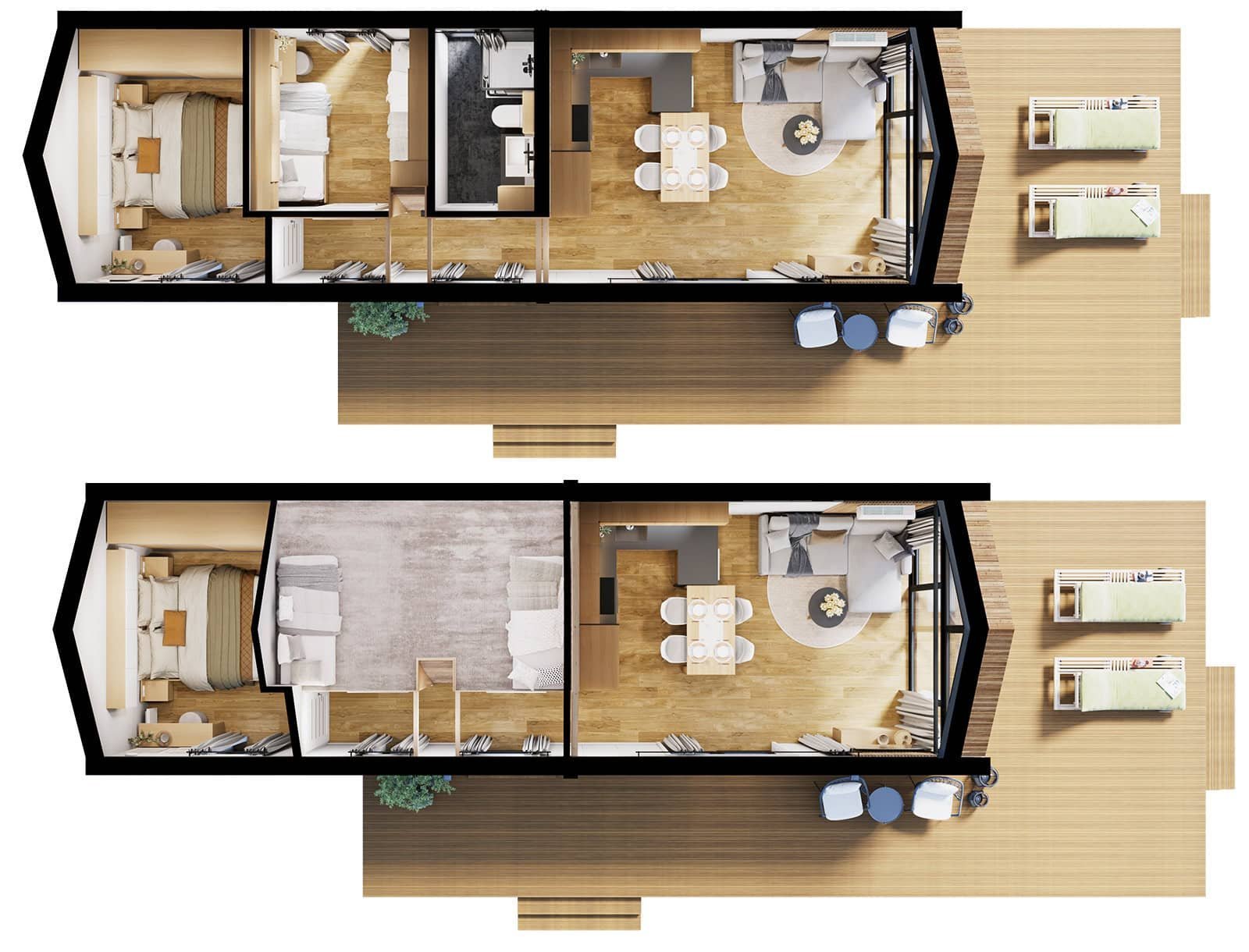 Le modèle F3  est actuellement le mobil-home le plus grand et le plus spacieux de notre gamme. Il convient parfaitement comme résidence secondaire, résidence principale ou même maison individuelle pour un usage quotidien. Assemblé à partir de deux modules (deux mobil-homes plus petits) en une seule unité sur le terrain du client, il permet une installation même sur des terrains difficiles d’accès . Son architecture moderne, évoquant une grange traditionnelle , se caractérise par un toit incliné à 35 degrés , une mezzanine surplombant une partie du rez-de-chaussée et un séjour avec une belle hauteur sous plafond. Un élégant pignon vitré ouvre le séjour sur la terrasse et le jardin. L’intérieur, conçu avec soin, est composé de deux modules dont les joints sont invisibles une fois le mobil-home assemblé . L’architecture intérieure associe des éléments en bois à des murs blancs et des touches de graphite. Nous proposons la maison en trois variantes et dimensions extérieures : variante de base 1 ( 13,10 m x 4,2 m) , variante 2 ( 13,5 m x 4,2 m) et variante étendue 3 ( 14,1 m x 4,2 m). Chaque variante dispose de deux ou trois chambres et d’une mezzanine .
