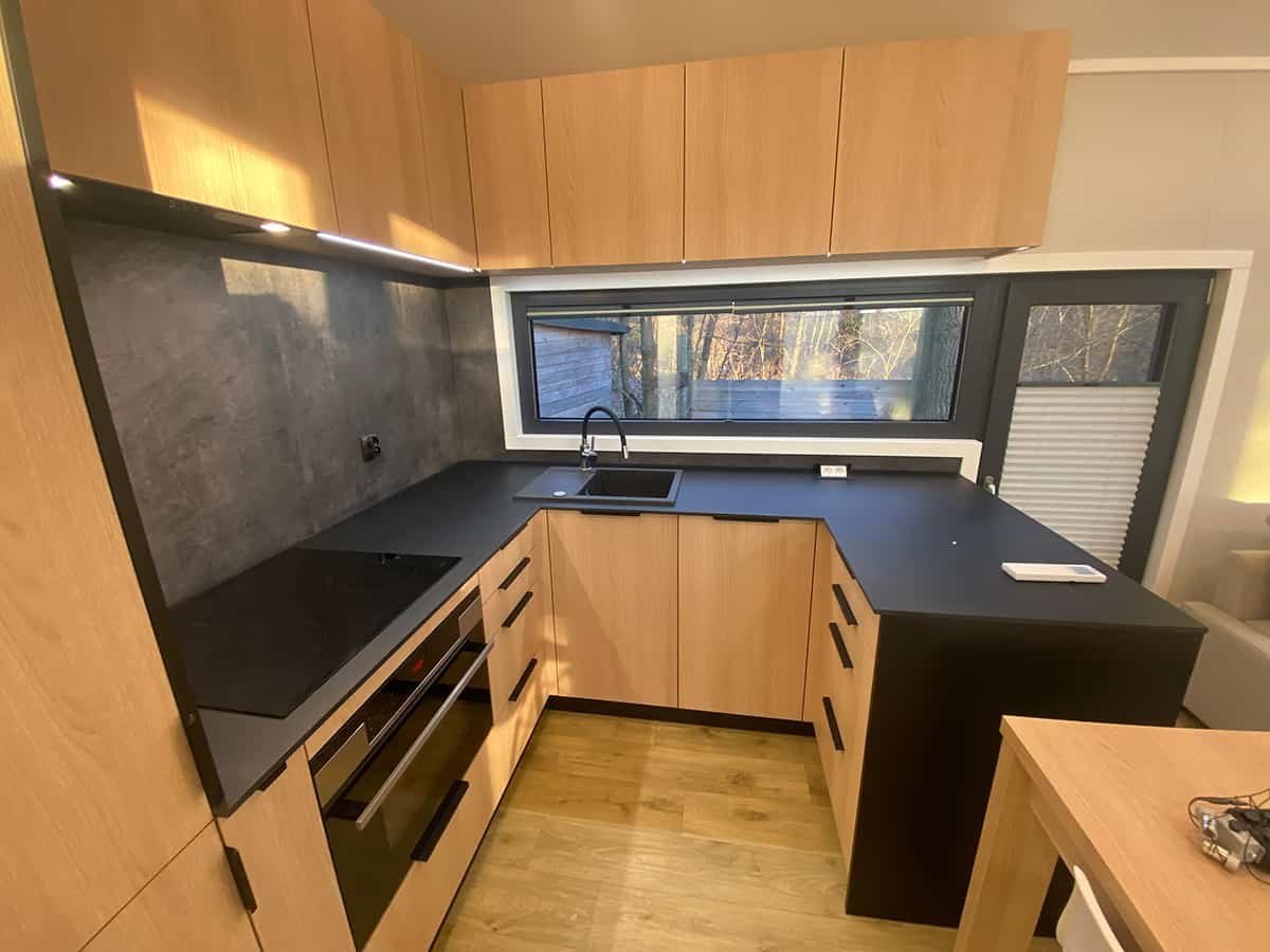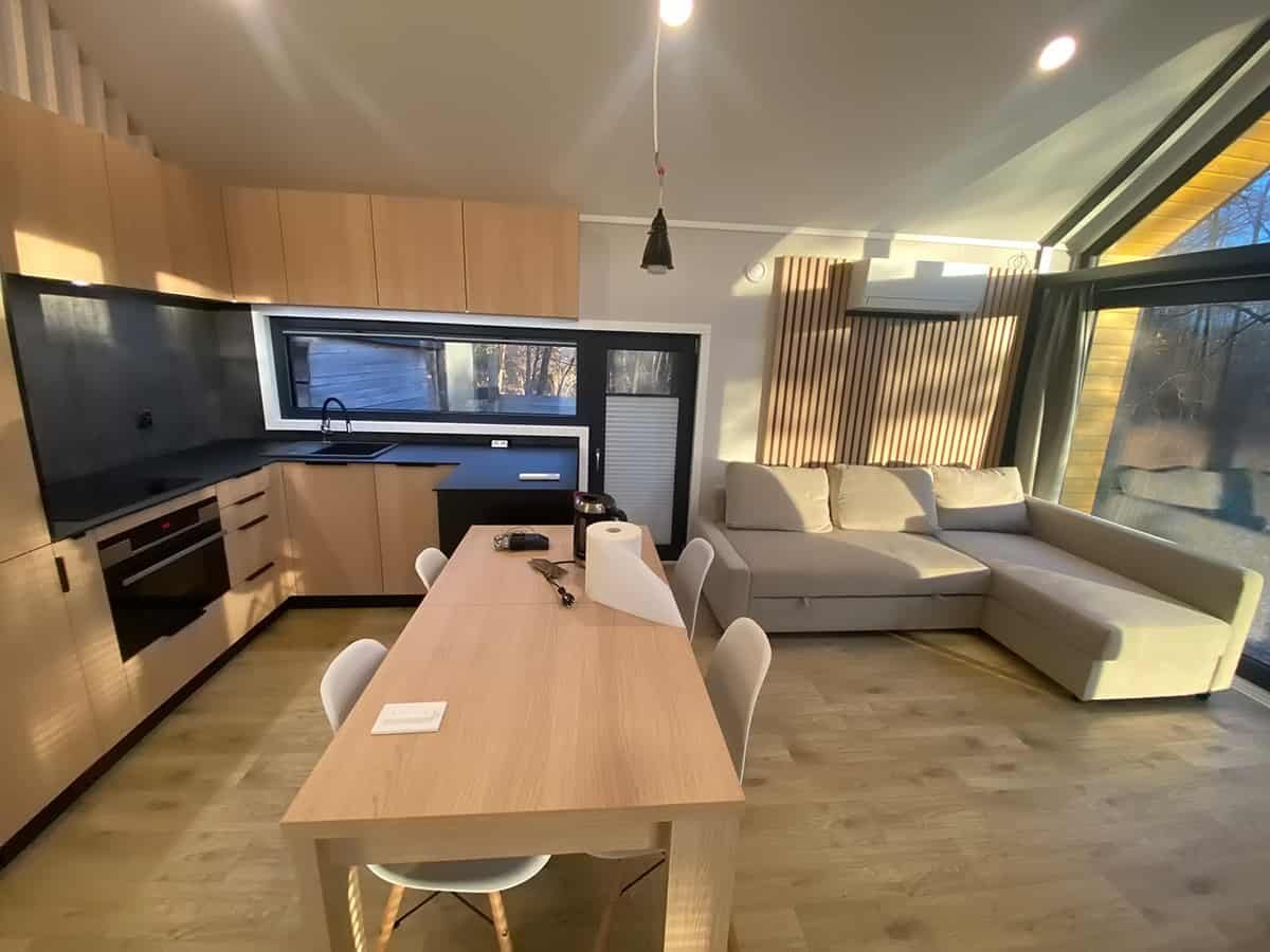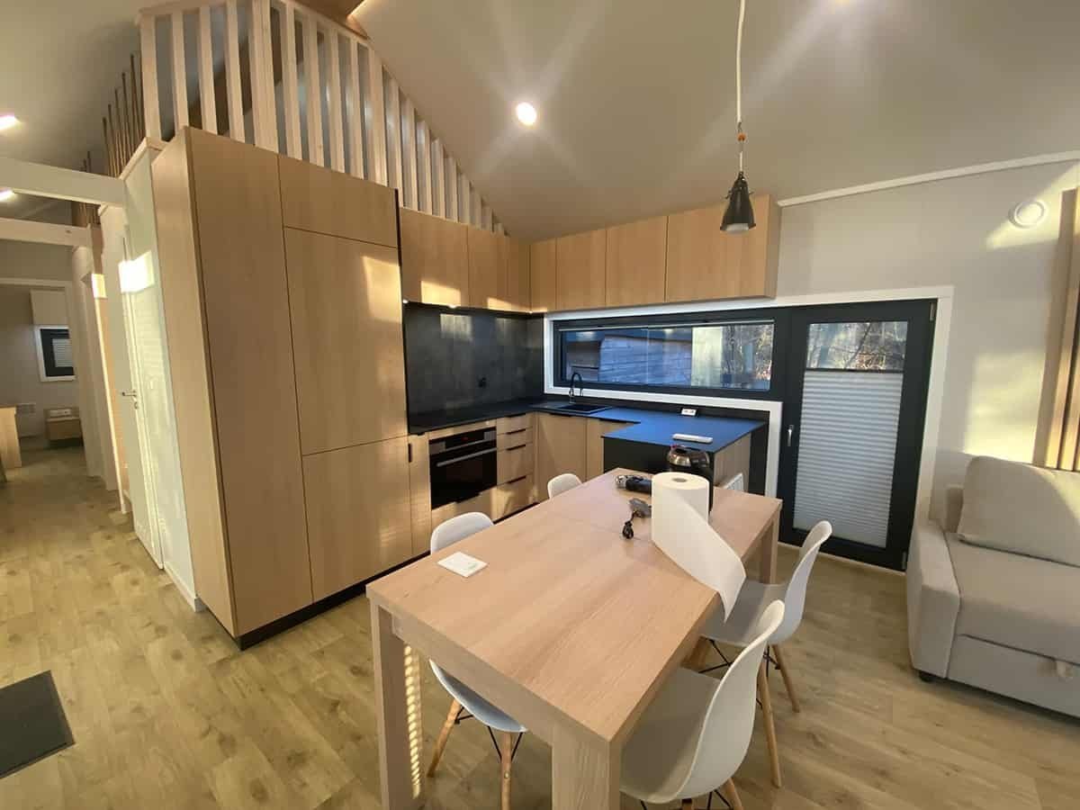 L’intérieur de la maison, quelle que soit la finition choisie, est  entièrement fini : murs, plafonds et sols sont revêtus.  Les murs intérieurs  sont habillés de panneaux PVC ou Strama, ou partiellement de panneaux Fibo (en option). Pour ceux qui préfèrent un intérieur rustique, nous proposons des finitions murales en bois naturel. Les plafonds  sont revêtus de panneaux Strama ou, en option, de bois naturel. Les sols de la maison modèle F3  sont recouverts d’un revêtement de sol PVC Lentex haute résistance à l’abrasion. Nous proposons également un revêtement de sol vinyle ou, en option, un parquet stratifié. Dans  la version Premium,  la maison est entièrement meublée : nous fabriquons nous-mêmes le mobilier, spécialement pour ce projet, dans notre atelier de menuiserie.  Le mobilier  est réalisé en panneaux stratifiés imitation bois, ou sans finition imitation bois, dans la couleur de votre choix.  L’électroménager , les sanitaires et les meubles rembourrés sont disponibles en option, selon les spécifications choisies.