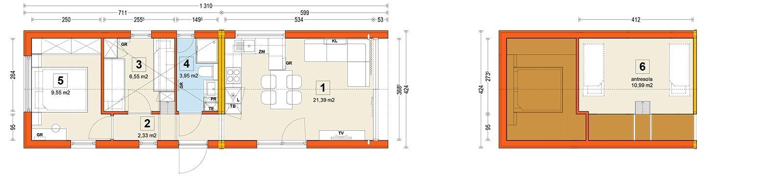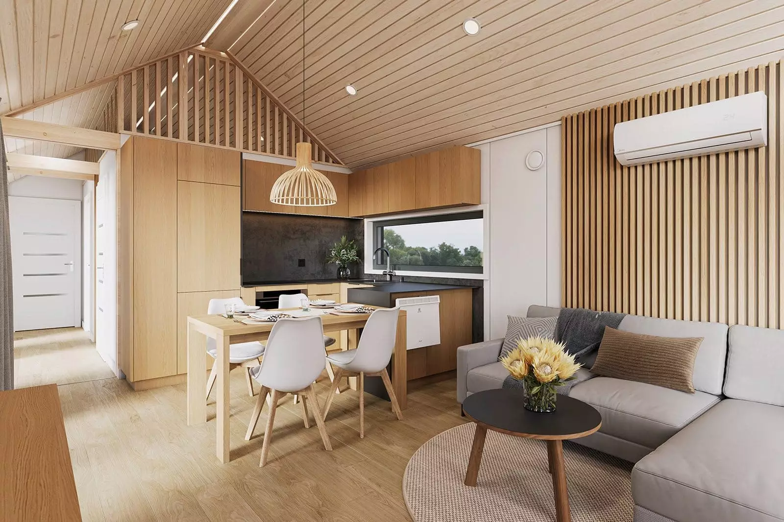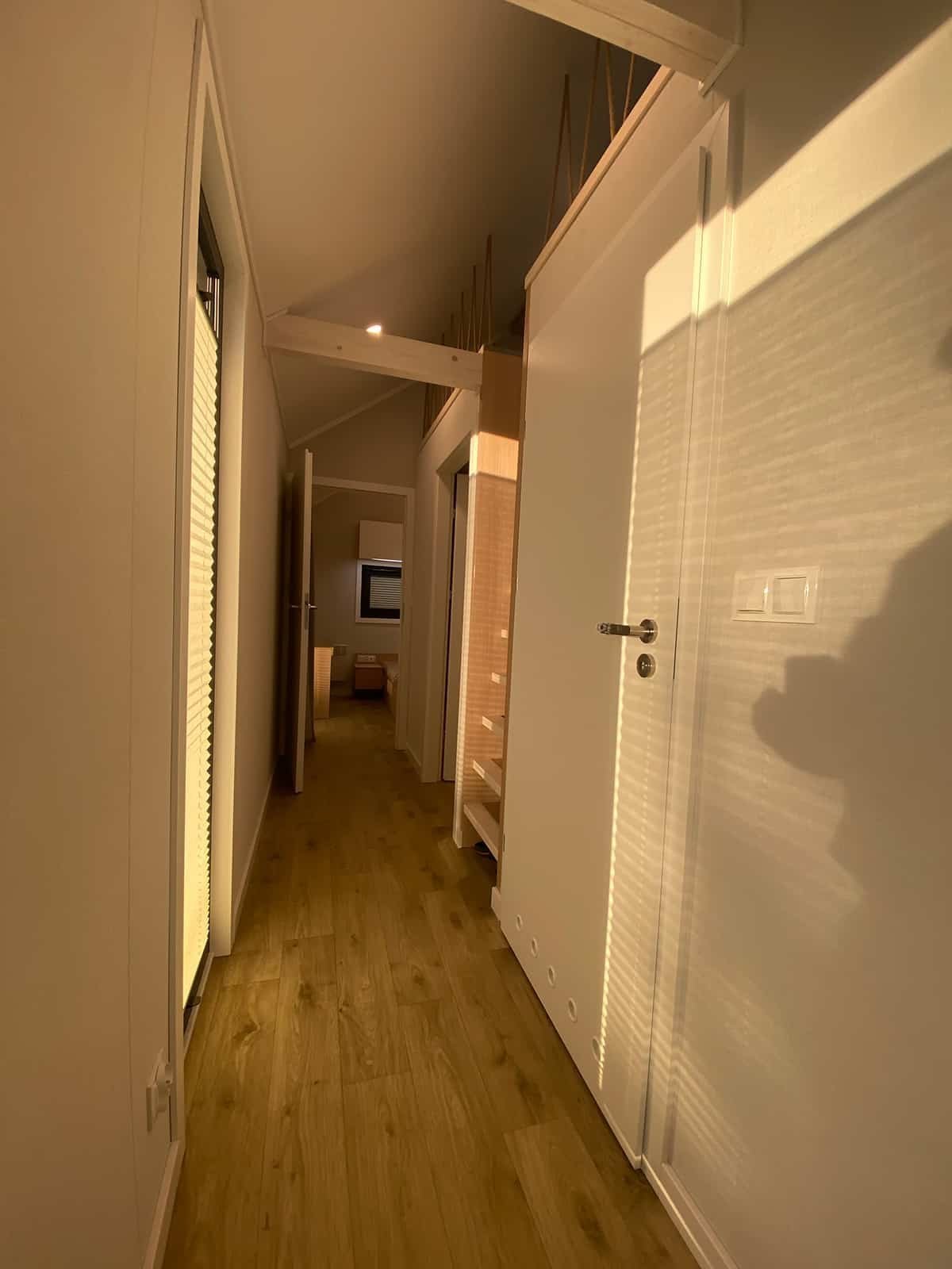 L’intérieur de la maison se divise en deux parties :  un espace de vie  – comprenant un salon ouvert sur une kitchenette en forme de U et un large couloir – et  un espace nuit  – avec une salle de bains et deux ou trois chambres. L’entrée se fait par la porte principale située dans le  couloir central  , d’où l’on accède aux différentes pièces. En face de l’entrée se trouvent  un dressing et une buanderie  . À droite, on longe l’espace de vie, et à gauche, le couloir mène à la chambre et à la salle de bains. Depuis le couloir, une échelle permet également d’accéder à la mezzanine.