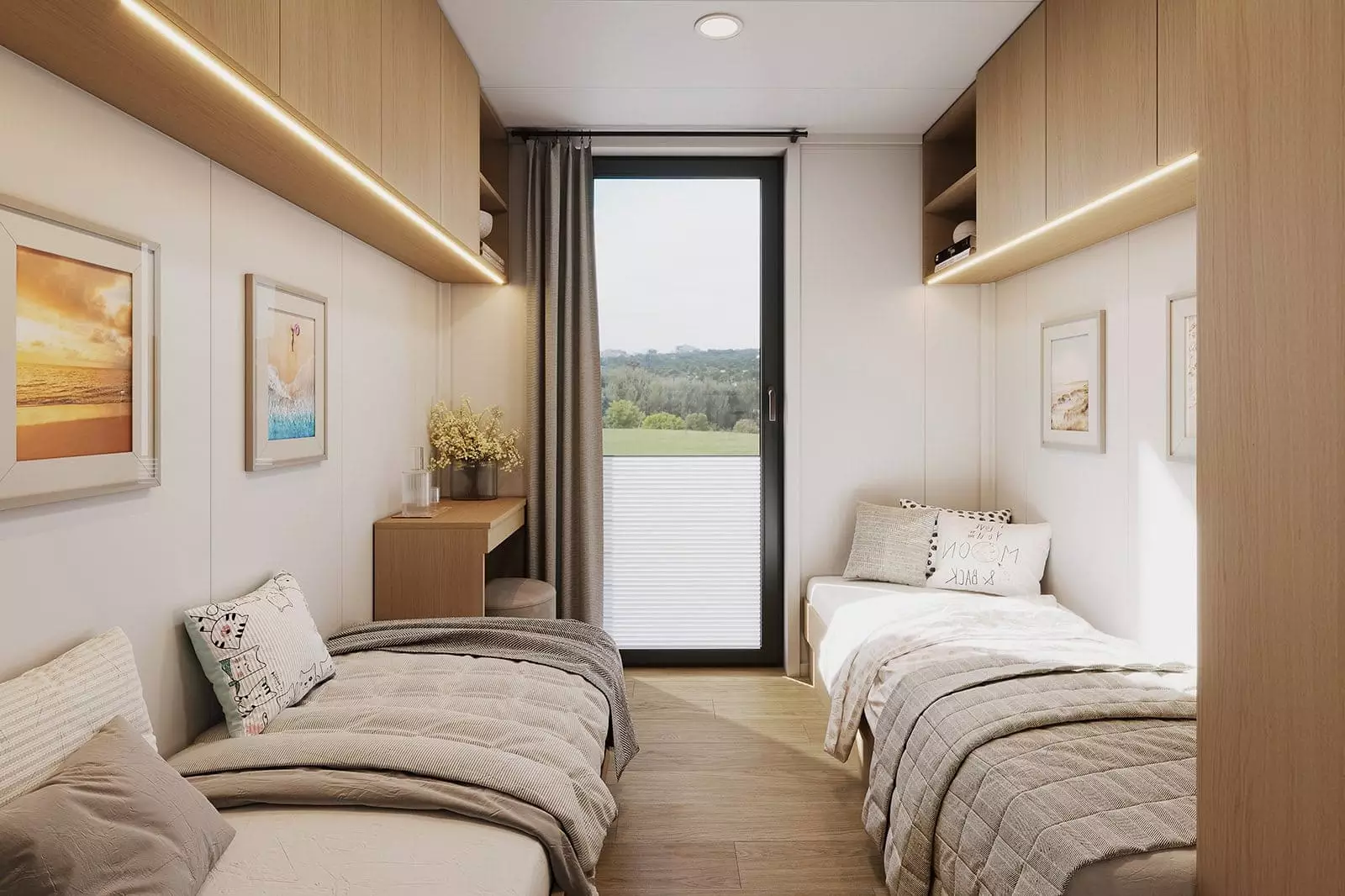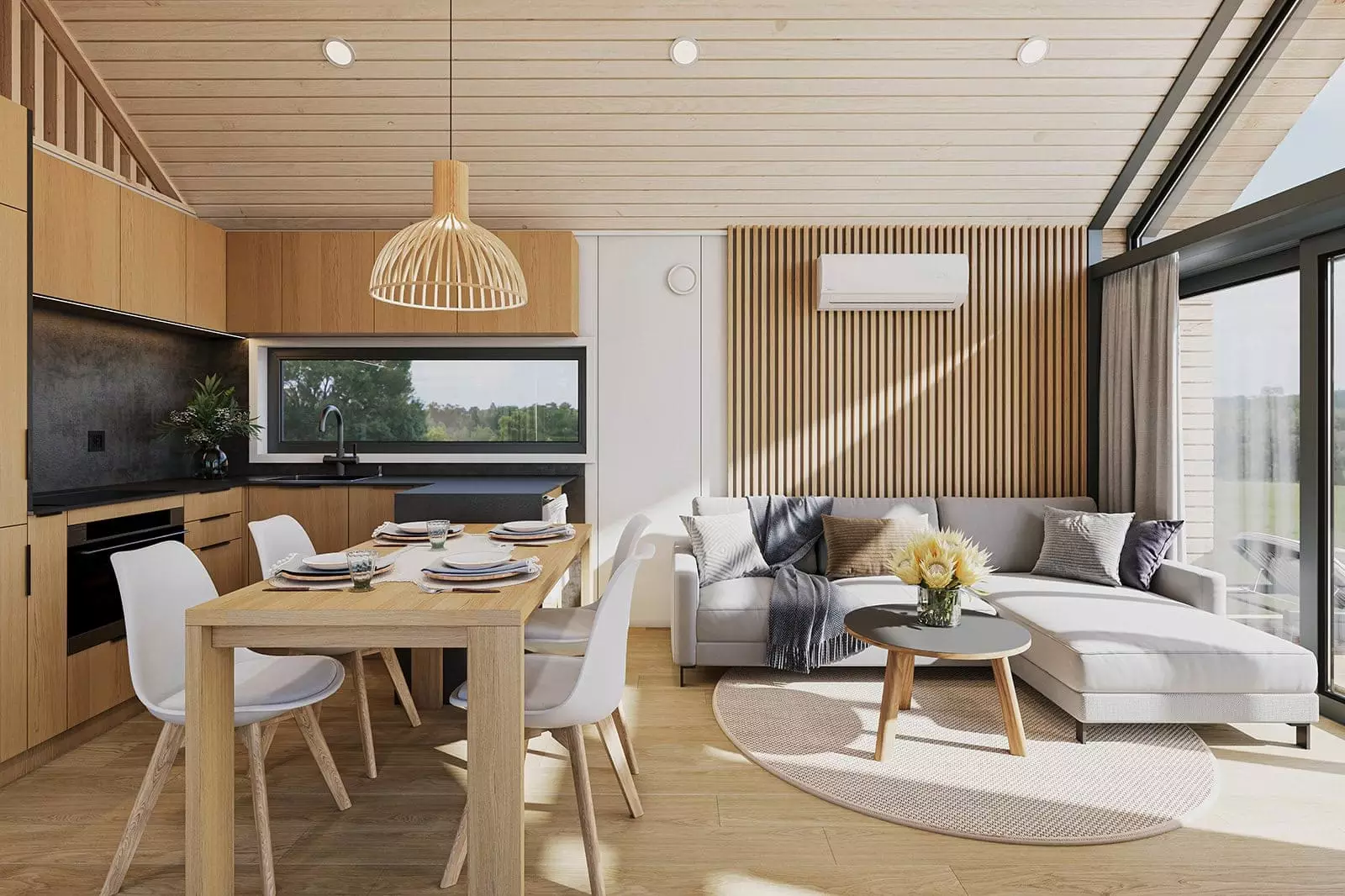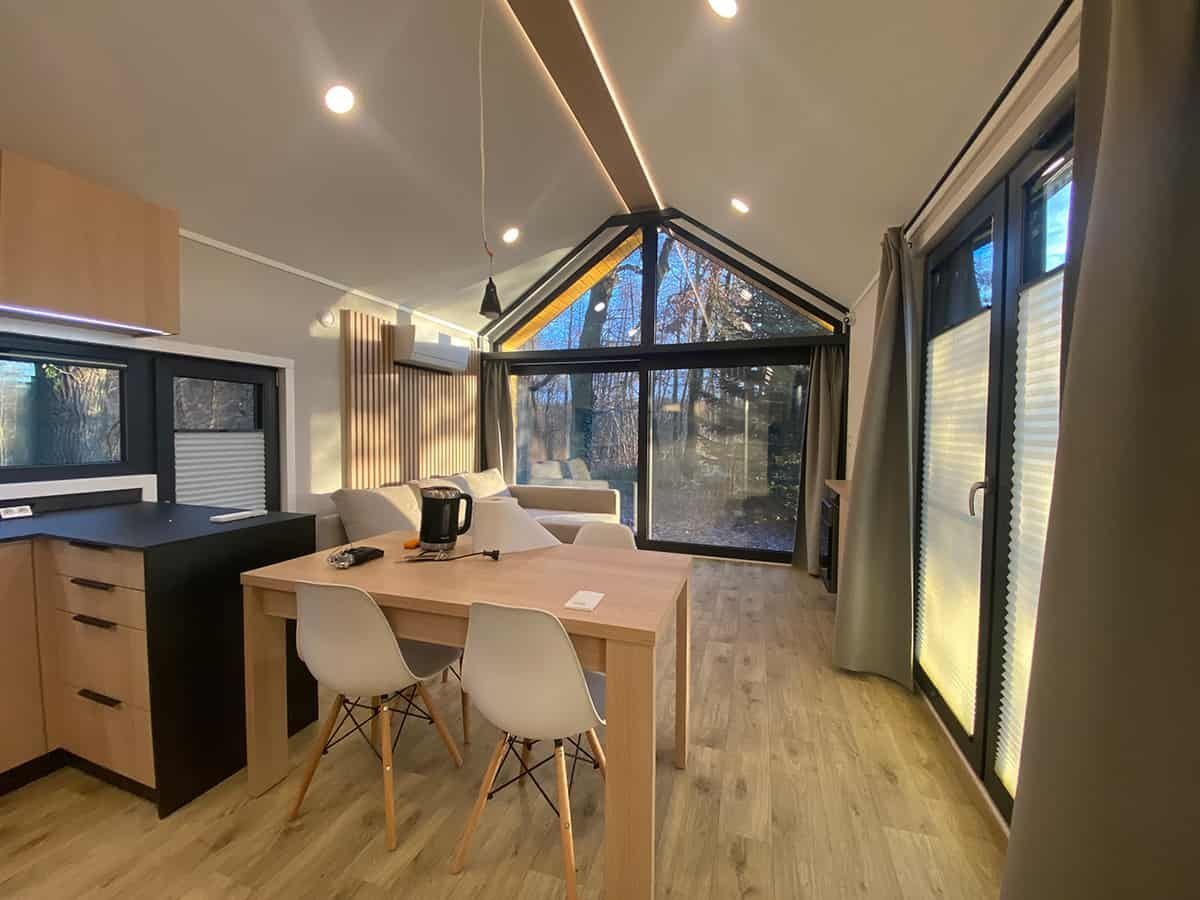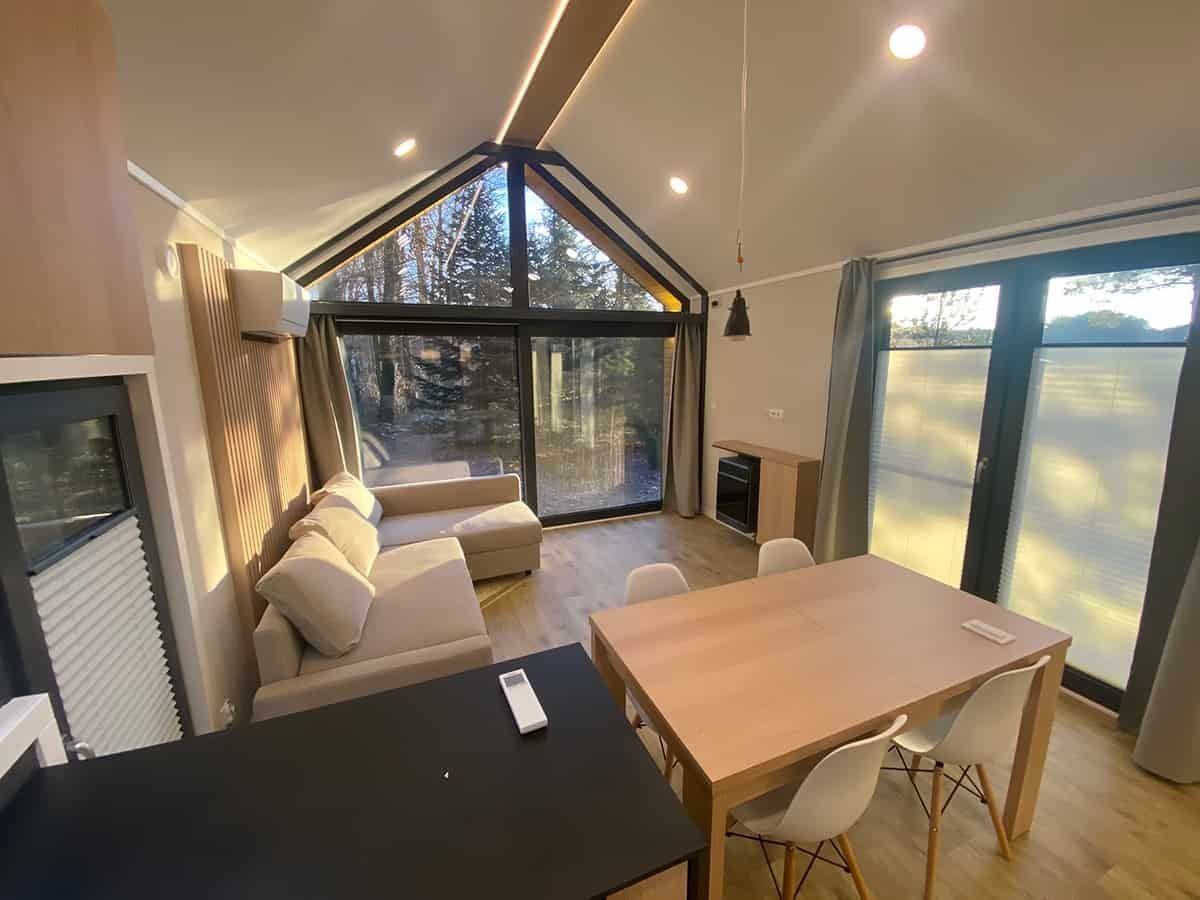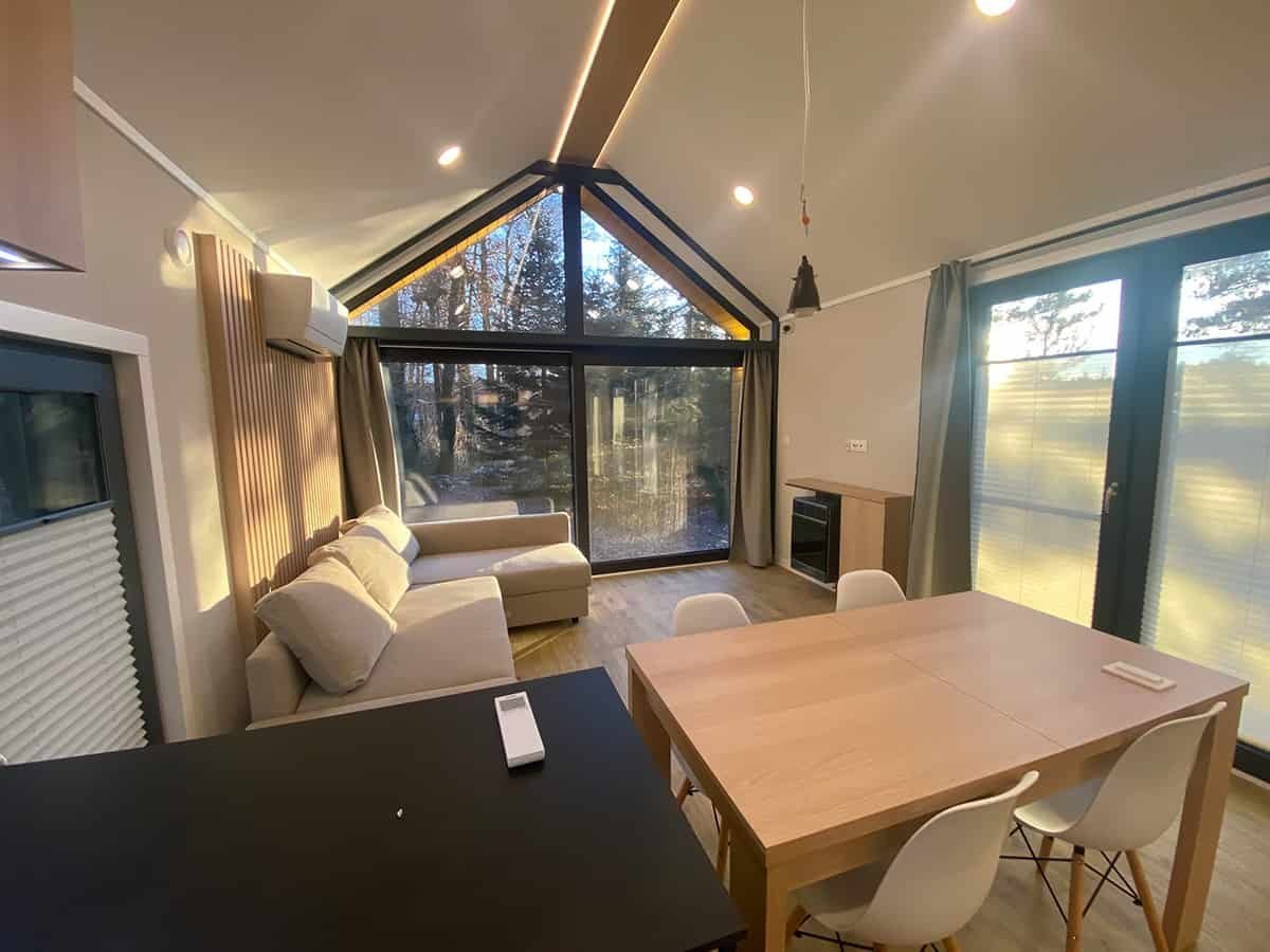 L’intérieur de la maison modèle F3 se compose d’un vaste espace de vie comprenant un séjour, une cuisine en U et un large couloir desservant les pièces, ainsi que des chambres et une salle de bains. Au-dessus des chambres et de la salle de bains, une mezzanine, accessible par un escalier depuis le couloir, surplombe le séjour et se fond avec lui en un seul volume spacieux. La conception fonctionnelle de la maison, avec deux ou trois chambres, offre un confort optimal à une famille de quatre ou cinq personnes, qu’elle soit destinée à une résidence secondaire ou principale. Les hauts plafonds, ouverts jusqu’au faîte du toit, et les grandes fenêtres donnant sur le jardin environnant contribuent à une sensation d’espace et créent une atmosphère unique. (…)