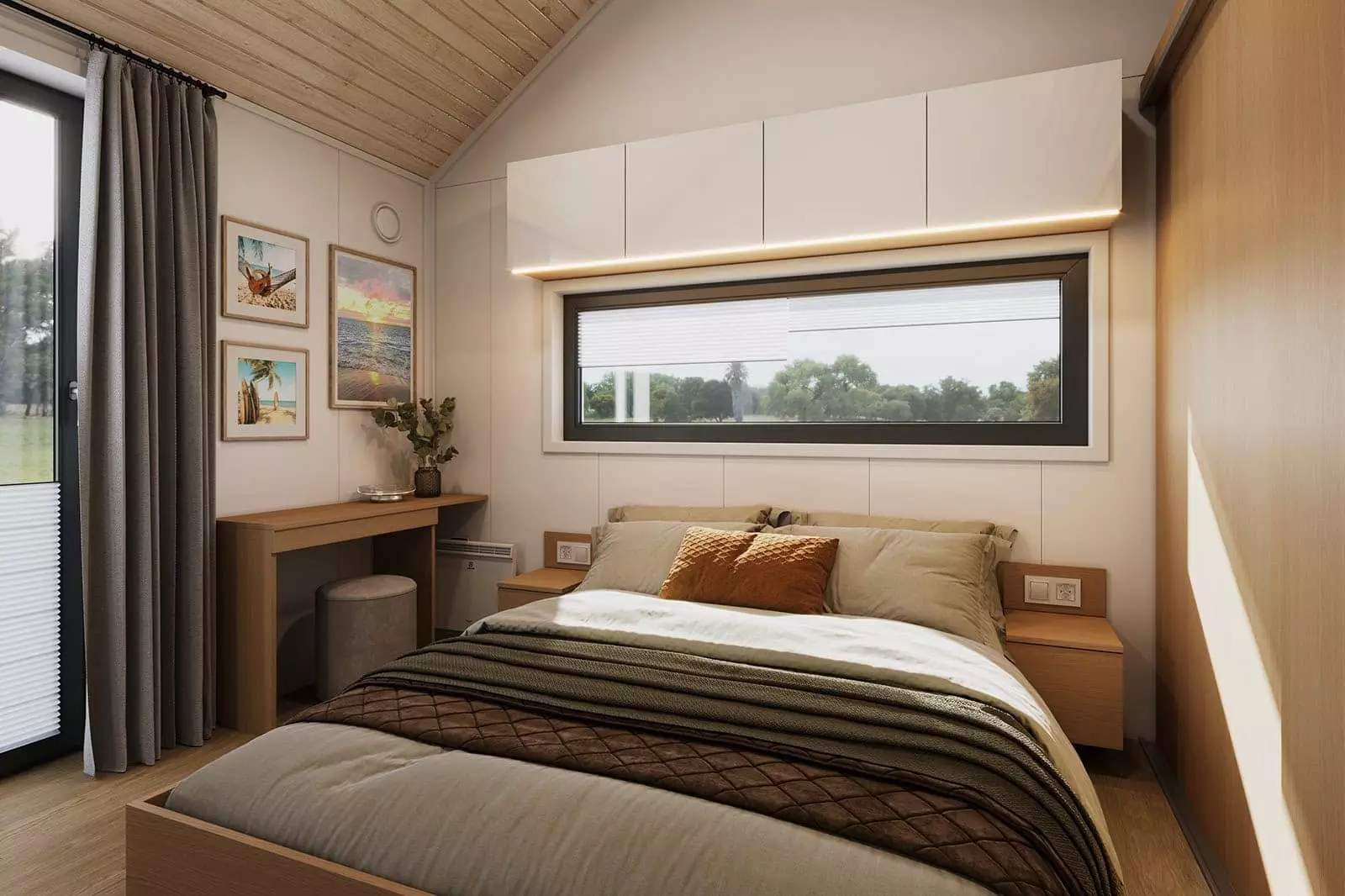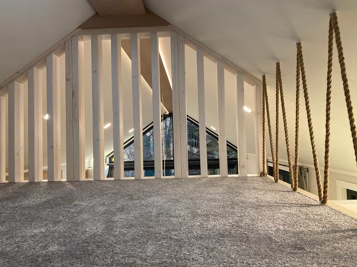 Le séjour avec kitchenette impressionne par son espace, sa belle hauteur sous plafond et sa large  baie vitrée  coulissante  qui ouvre l’intérieur sur la terrasse et le jardin. Il comprend  un coin salon , un mur TV et  une table à manger  avec chaises. Le plafond, très haut avec sa pente à 35 degrés et ouvert jusqu’au faîte, accentue l’impression d’espace. Le séjour communique avec la mezzanine , séparée par une balustrade ajourée. La chambre parentale  est équipée d’un lit double avec rangements, d’armoires et d’une large fenêtre en pignon, ainsi que  d’une armoire murale  et d’une coiffeuse avec miroir.  Les chambres d’enfants, selon la configuration, peuvent accueillir un ou deux lits doubles  , des armoires, des placards muraux et des mini-bureaux. La salle de bains comprend une cabine de douche  , des toilettes suspendues, un meuble vasque avec miroir, un sèche-serviettes, des placards muraux et un emplacement pour un lave-linge. Le chauffe-eau est astucieusement dissimulé dans les meubles intégrés. En plus de la version de base de la maison, nous avons conçu  deux variantes d’intérieur fonctionnelles  supplémentaires  pour le modèle F3 – les plans des variantes sont présentés  ci-dessous .